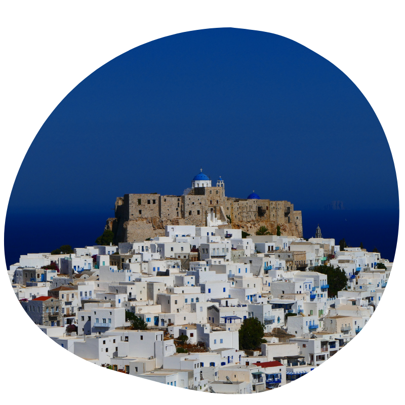 Η Χώρα, ένα παραδοσιακό κυκλαδίτικο χωριό με κάτασπρα σπίτια και το Ενετικό Κάστρο των Κουερίνι στην κορυφή του λόφου.